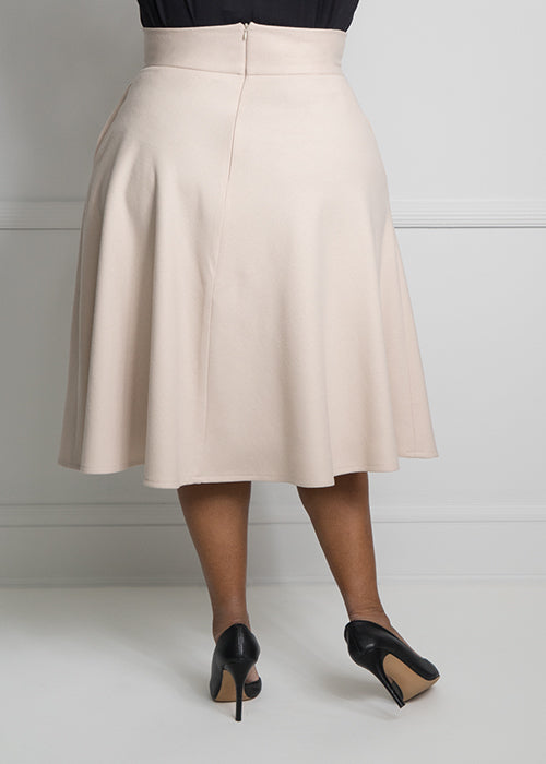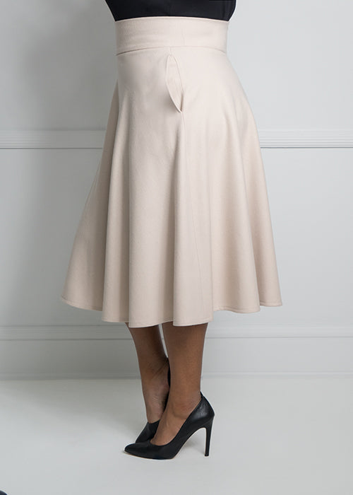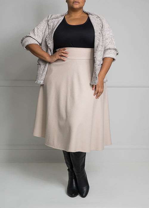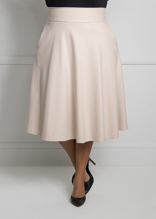 This gorgeous handmade skirt from indie designer Jibri is made of a sumptuous wool, with just a hint of stretch The high waist and full skirt are incredibly flattering on almost any frame and the midi length gives an elegant feel to this special pieces. Pair with tights and booties and a cashmere or silk top to keep the look chic and ultra high end.